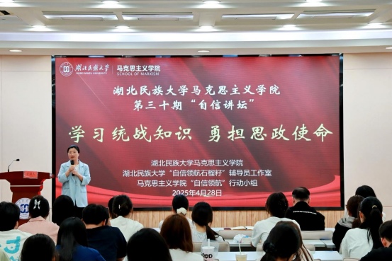 4 月 28 日, 由bat365在线中国登录入口“自信领航石榴籽” 辅导员工作室、马克思主义学院和马克思主义学院“自信领航”行动小组联合举办的第三十期 “自信讲坛” 在德智楼三楼远程教学观摩室成功举办。活动特邀全国高校“双带头人”教师党支部书记“强国行”专项行动团队湖北民族大学“双带头人”教师党支部书记“强国行”专项行动团队负责人、马克思主义学院教授蔡诗敏老师担任主讲人。“自信领航石榴籽” 辅导员工作室成员、马克思主义学院 “自信领航” 小组成员出席活动,马克思主义学院大一全体学生也积极参与其中。