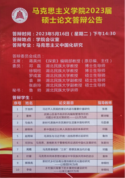 马克思主义学院2023届硕士毕业论文答辩公告二