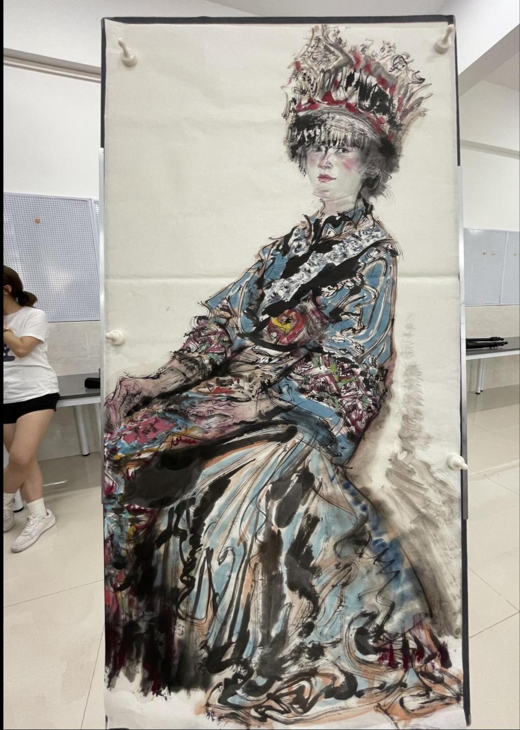 下午2:30在12栋C区301教室任惠中教授进行中国人物画写生教学示范,结合上午讲座知识,仔细向师生介绍了水墨人物的写生方法及要点,强调写生要投入感情,并以笔墨传达出来,着色不要太过拘泥对象,使画面形象“更”具模特特征,重在人物神韵的刻画与表达;强调作画过程中不要怕犯错,要因势利导使画面和谐起来。当日下午现场完成了着色人物写生作品1件、线描写生作品1件。任惠中教授的示范无不令现场师生大开眼界,收获满满。