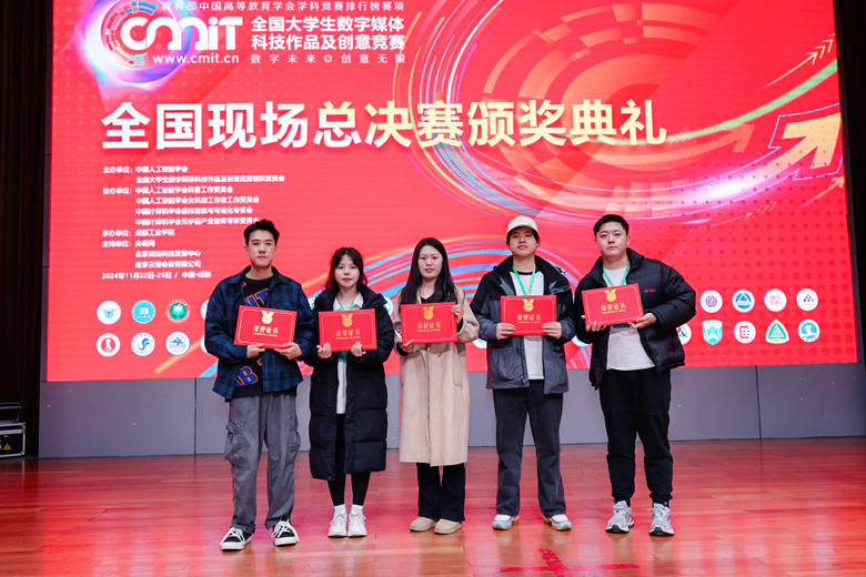 2024年11月23日- 25日,由中国人工智能学会、全国大学生数字媒体科技作品及创意竞赛组委会主办,国内多所高校联合承办的“2024年第十二届全国大学生数字媒体科技作品及创意竞赛全国现场总决赛”在成都盛大举行。我院杨梓秦老师带领刘文燕、刘晋江、梁涛、张雨辉、周紫凝五名同学前往总决赛现场进行参赛。