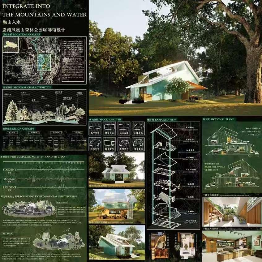 环境艺术设计展区:以“创意施州2025”为主题,从非遗体验空间的构建,到乡村旅游节点的策划,用创意连接传统文化与当代智能技术,如作品《融入山水—恩施凤凰山森林公园咖啡馆设计》。