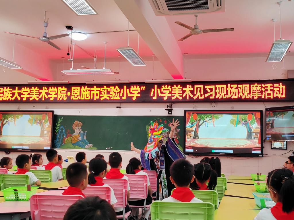 6月12日,于恩施市实验小学:见习生深入体验了四节风格各异的美术课。孙梦晗老师的《换衣裳》通过服饰设计培养学生的色彩搭配能力;杜宗艳老师的《恩施傩面具》通过创设情境带领学生领略本土非遗文化的魅力;肖婧蓉老师的《听听画画》将音乐与绘画结合,探索跨学科艺术教学;李蓉老师的《银饰之美》则通过传统银饰制作,锻炼学生的动手能力。