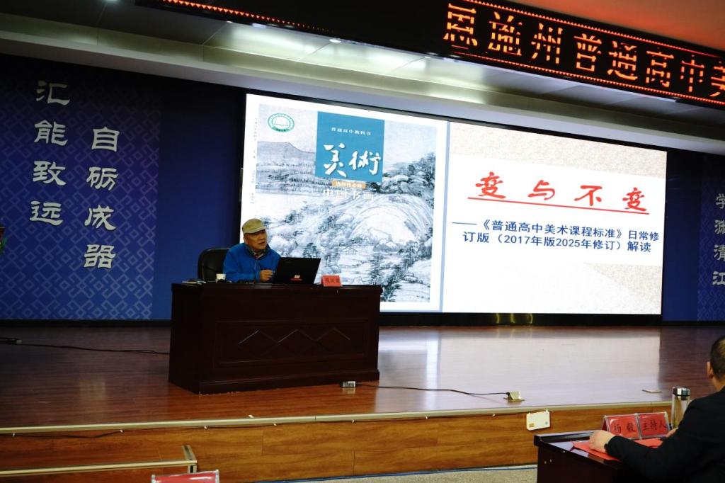 3月27日上午,教育部义务教育美术课程标准修订组核心成员周凤甫教授以《变与不变》为题,对《普通高中美术课程标准日常修订版(2017年版2025年修订)》进行了深度解读,并以《模块·理念·结构——人美版普通高中美术教科书(中国书画)模块教学案例》为题通过具体案例阐释了教材编写理念与教学实施策略。