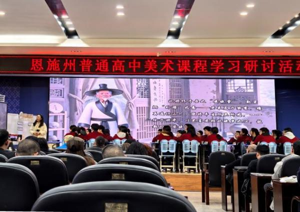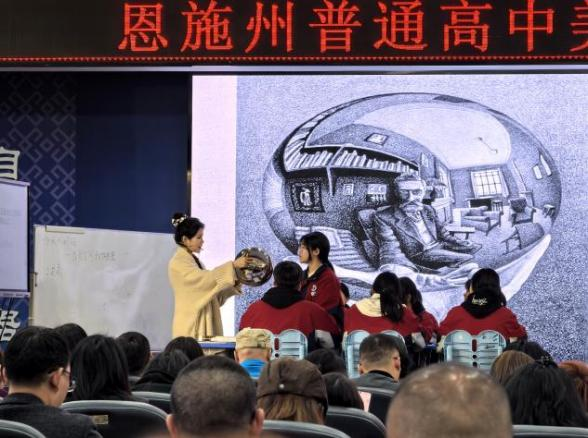 优秀课堂呈现有:《场域与对话——公共空间里的雕塑》由恩施市第二中学的谭怡航老师授课,探索空间与艺术的对话;由恩施市第三中学柳文老师授课的《交流与传承——东西文化碰撞中的艺术嬗变》,从宏观的视角带学生感受东西方文化融合之美;利川市第五中学明露老师授课的《抒情与写意 文人画——白眼观悲世 巨眼识穷途》带学生了解朱耷多舛的命运,体悟笔墨间的兀傲之气,走进中国传统文人画的精神世界;常州市教科院附属高级中学的康宁老师讲授的《传神写照“锦瑟年华”人物画创作》,以《韩熙载夜宴图》为例,探索中国人物画的传神之道。同学们认真记录、积极思考,在观摩中感悟教学的艺术。