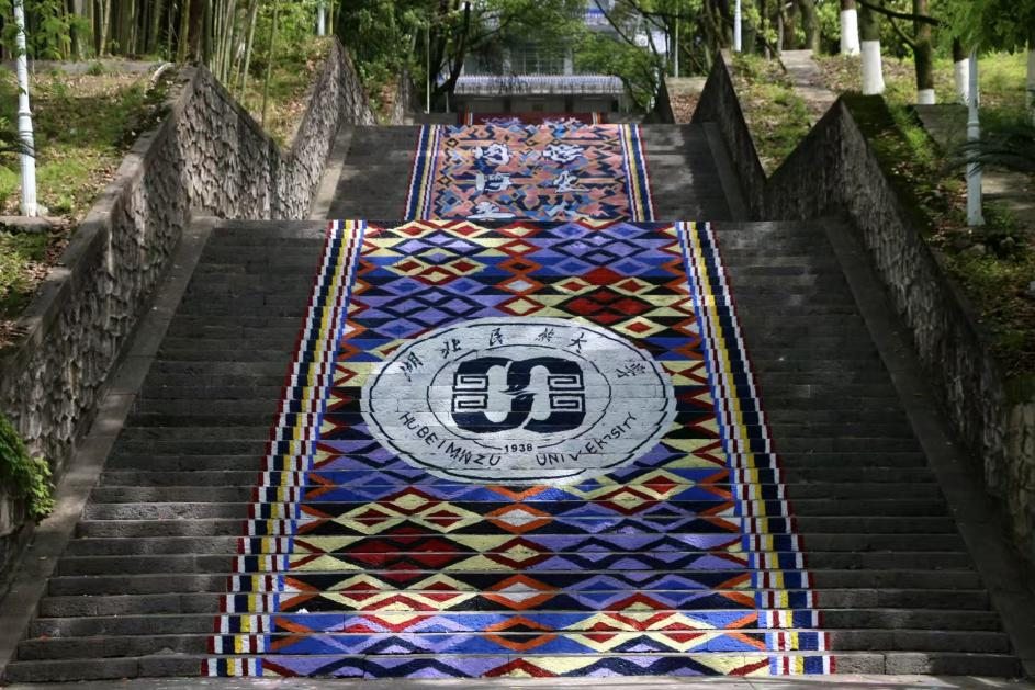 本次彩绘将133级阶梯划分为六个主题区域,巧妙融合廉政文化、民族文化、校园文化。层层递进,寓意深远:第一级:土家织锦莲花纹与校徽相映,喻示“清廉为本、母校为荣”。第二级:菱形花纹与校训结合,传达“恪守规范、践行誓言”。第三级:状元花寄托积极向上、奋发进取之志。第四级: 筒盖花象征团结协作、共同进步。第五级:小莲蓬花寓意纯洁无瑕、清正自守。第六级:抽象几何纹搭配《六悔铭》,以理性纹样与经典警句,提醒师生常怀敬畏、防微杜渐。旨在让师生在日常生活中潜移默化地接受廉政教育,筑牢拒腐防变的思想道德防线,同时传承和弘扬中华优秀传统文化。