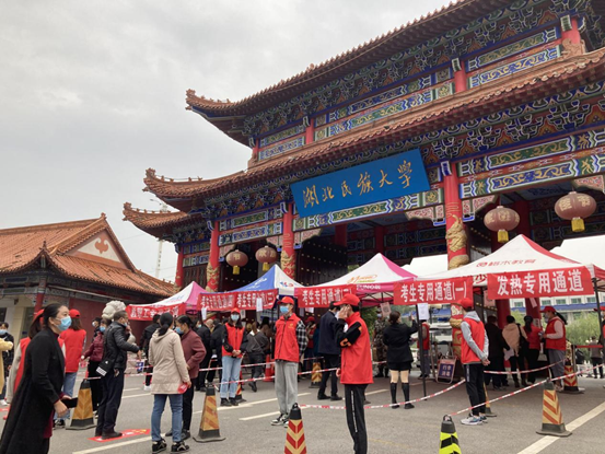 志愿服务过程中,各志愿者严格按照疫情防控要求指引考生有序测温进场并能及时应对突发情况。
