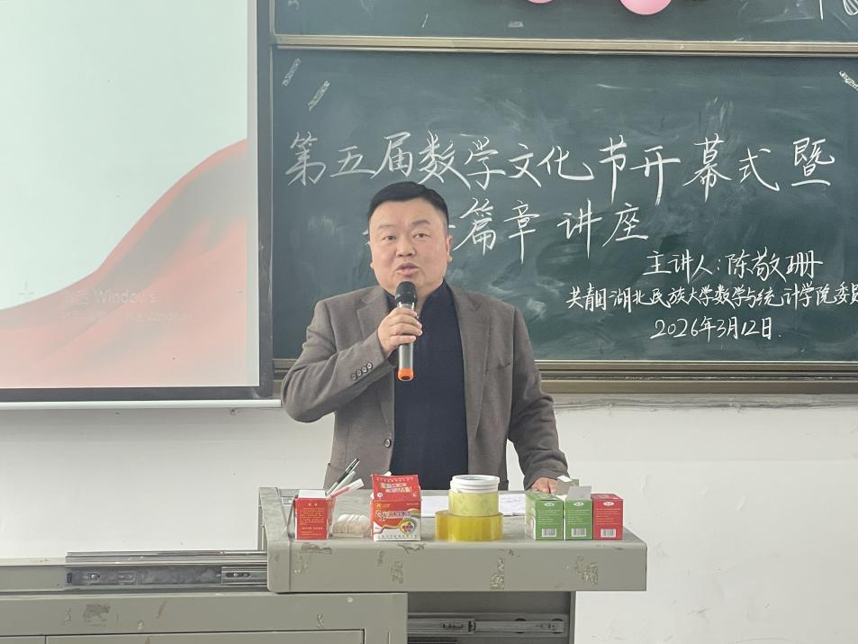春风送暖,数韵飘香。为弘扬数学文化,营造浓厚学术氛围,丰富校园文化生活,3月12日下午,数学与统计学院第五届数学文化节开幕式暨第一篇章专题讲座在3308教室顺利举办。学院党总支书记魏代俊、院长唐利明、学院党总支副书记郑敏、团委书记王宁奎、学生科副科长廖祥宇、学生科辅导员李子君、特邀专题讲座老师陈敬珊出席活动,典礼由许万金子同学主持。