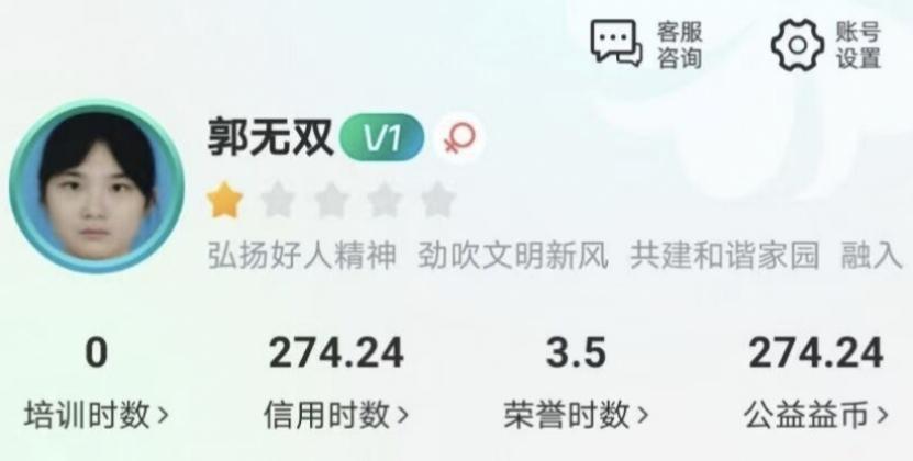 郭无双在保持专业课成绩优异的同时也积极参与课外活动。她利用课余时间投身于志愿服务,累计志愿时长超过270小时。“作为在党与国家关心下长大的零零后,志愿服务一直是我心中最坚实的精神支柱。”被问到如何看待志愿服务时,她这样答道。不啻微茫,造炬成阳。进入大学后的郭无双总在关注和参加各种志愿服务活动,积少成多,努力用自己微薄的力量为社会作出贡献。在志愿服务活动中,郭无双常走进社区为居民普及应急急救知识和传染病预防知识,帮助居民们测量血压,给予医疗建议。她也时常参与环保类的志愿服务,在河边、小区或街道上拾捡垃圾、进行垃圾分类和废品回收。对郭无双来说,志愿服务是一件“乐己”也“乐人”的事情。在帮助别人获得医疗知识和服务的同时,她也更好的通过实际行动将在学校中习得的医学知识和现实技术结合起来,增进了对现实状况的了解,为以后的职业道路作准备。