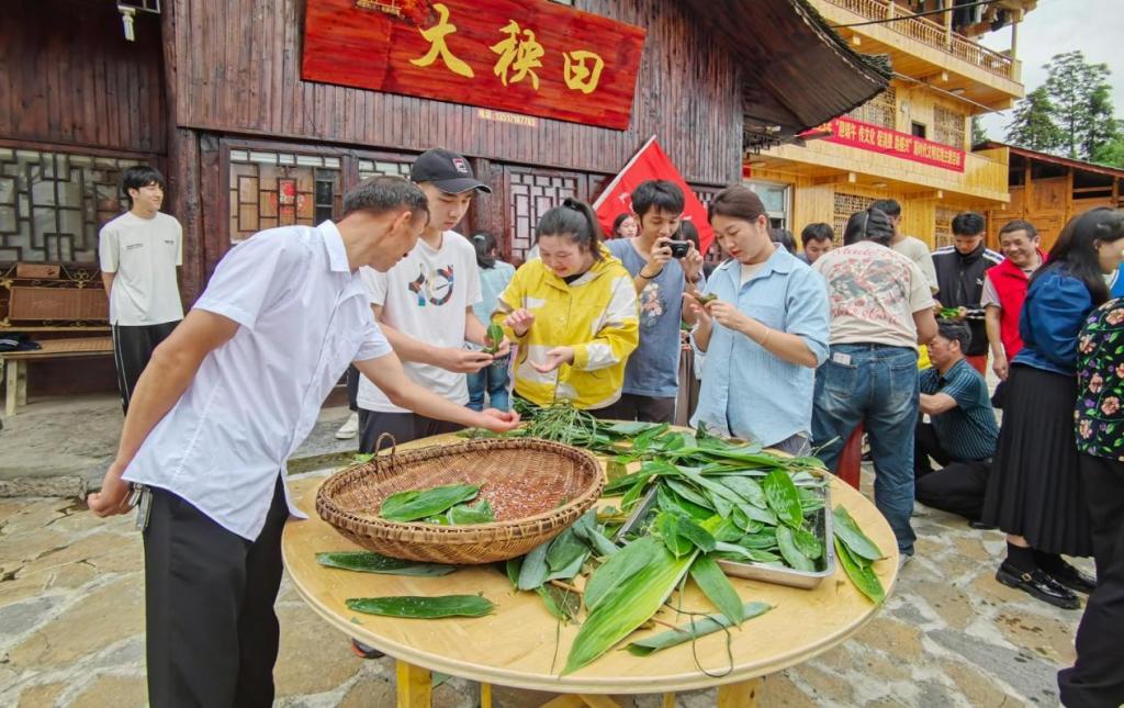 6月24日,毛坝镇兰田村在大秧田广场举办以“粽叶飘香迎端午,消费帮扶助振兴”为主题的活动。市委宣传部领导及相关科室负责人,毛坝镇领导及相关镇负责人,中南民族大学研学团师生,bat365官网农民工返乡调研队,兰田村新时代文明实践志愿服务队志愿者以及当地村民参加此次活动。