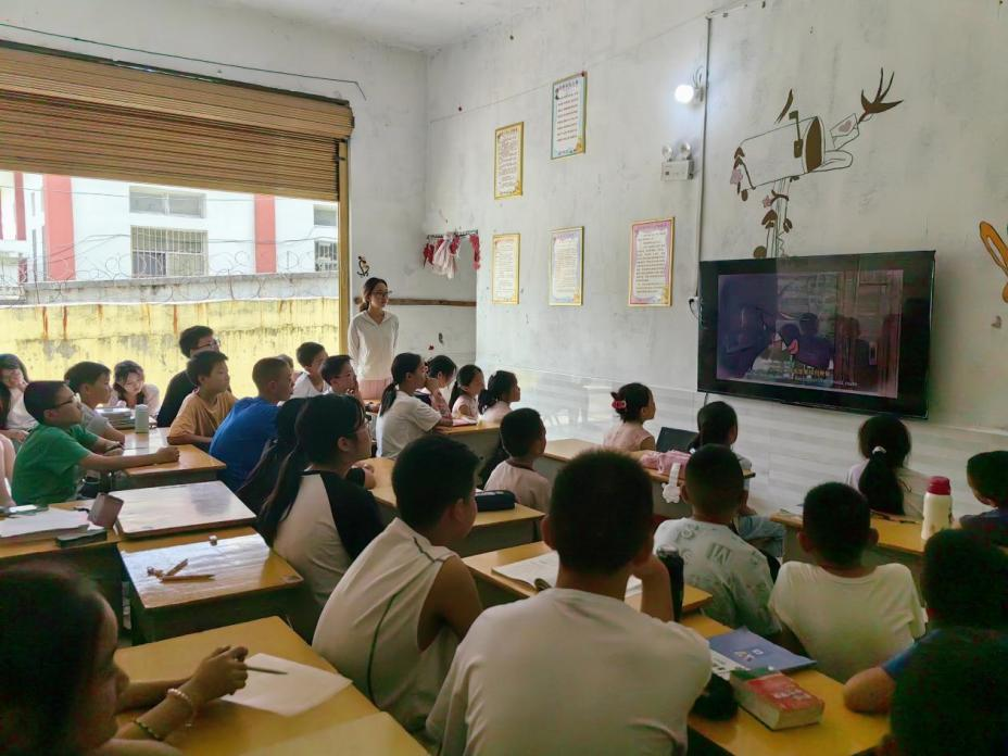 课堂伊始,支教老师田渝祺播放了一段趣味英语启蒙视频,视频通过生动有趣的动画帮助学生理解单词。学生们坐姿端正、凝神静听,表现出专注的学习状态。