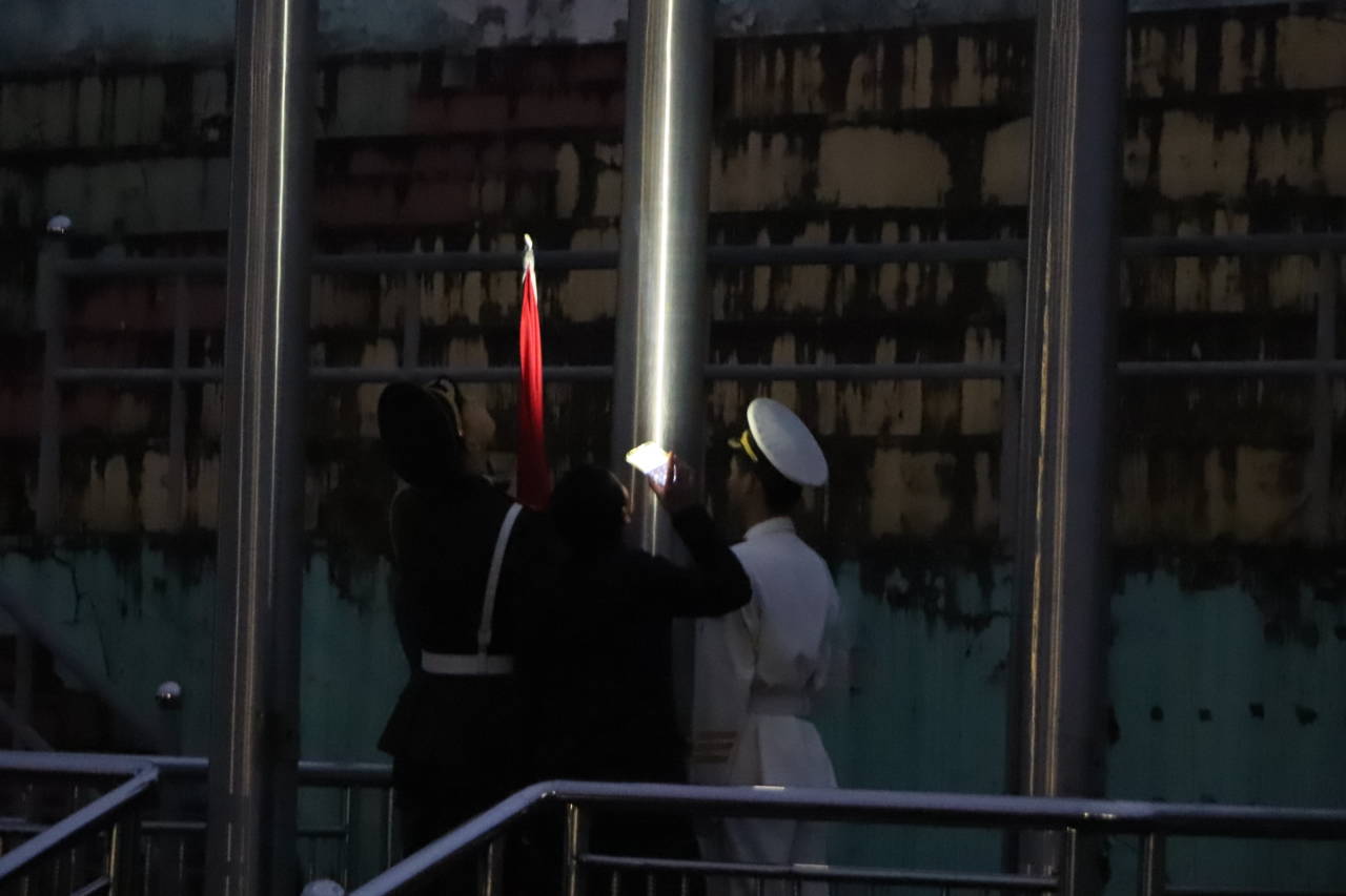 公祭仪式现场国旗下半旗,百余名师生默然肃立,国旗护卫队成员行进至公祭台两侧伫立。公祭仪式伊始,全体奏唱中华人民共和国国歌。国歌声毕,全场向南京大屠杀死难者默哀一分钟。
