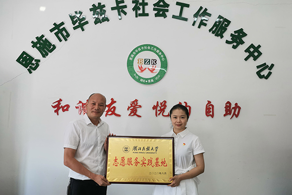 本网讯(通讯员 邓丽)为切实推动新时代新形势下高校思政工作创新,全面实施“第二课堂成绩单”制度,引领和激励广大青年学生继承和弘扬“奉献、友爱、互助、进步”的志愿精神,校团委积极探索“团干+社工+志愿者”志愿服务模式,9月4日上午,在恩施市义工协会、恩施州五彩社会工作服务中心、恩施市毕兹卡社会工作服务中心挂牌建立了3个大学生志愿服务实践基地。