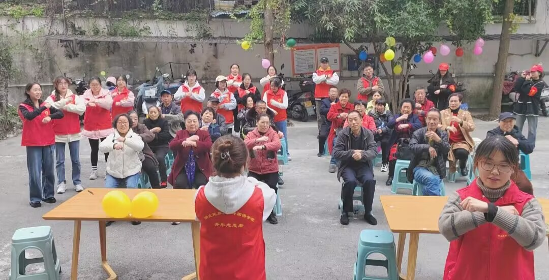 青春践行孝爱,敬老情暖人间。为丰富老年人精神文化生活,营造和谐友爱的社区氛围,同时提升青年大学生社会责任感、培养奉献精神。11月18日下午,外国语学院青年志愿者协会携手恩施市小棉袄社会工作服务中心共同举办以“智慧银龄,共创美好”为主题的社区志愿服务活动。本次活动在官坡社区开展,共30余名老人参加。