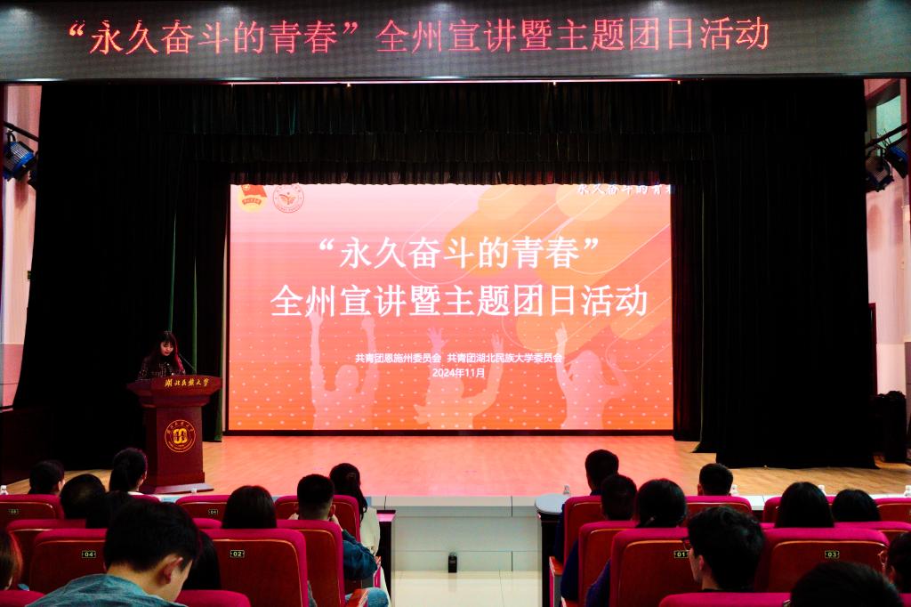 11月14日下午,由共青团恩施州委联合bat365官网共同举办的“永久奋斗的青春”全州宣讲暨主题团日活动在行政楼1号会议室顺利举行。湖北省青年宣讲团成员向硝硝,湖北向上向善好青年、恩施州青年宣讲“00后”宣讲员姜志容,湖北省青年岗位能手、国网恩施供电公司建始县红岩供电所副所长钟杨兴宇,恩施州消防救援支队金桂大道特勤站副站长蒋盟,第十一届中国青年创青春大赛(科技创新专项)金奖获得者王培尧应邀出席,恩施州直、市直单位以及三所高校的团员青年代表共计200余人参与了本次活动。