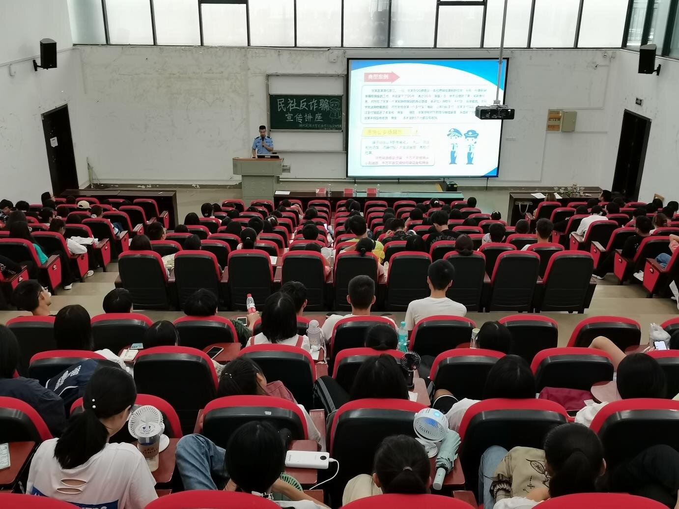 本网讯(记者 周树洋/文 肖欣 向丽华/图)为加深我院学生对电信诈骗手段的了解,提高自身防范意识,9月17日上午,我院团总支素质拓展部在修远楼5B403学术报告厅开展防电信诈骗讲座。土桥坝派出所反诈宣传员罗浩警官受邀担任主讲人,团总支书记熊霞应邀出席本次活动,我院大一、大二全体学生参与聆听。