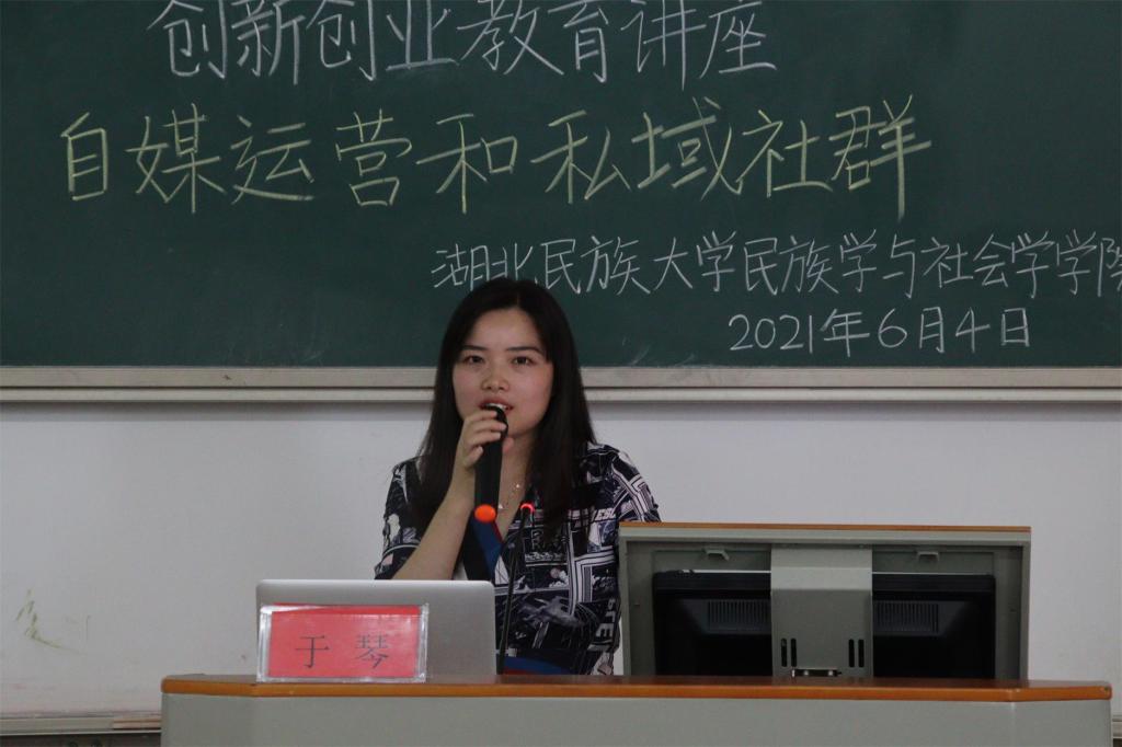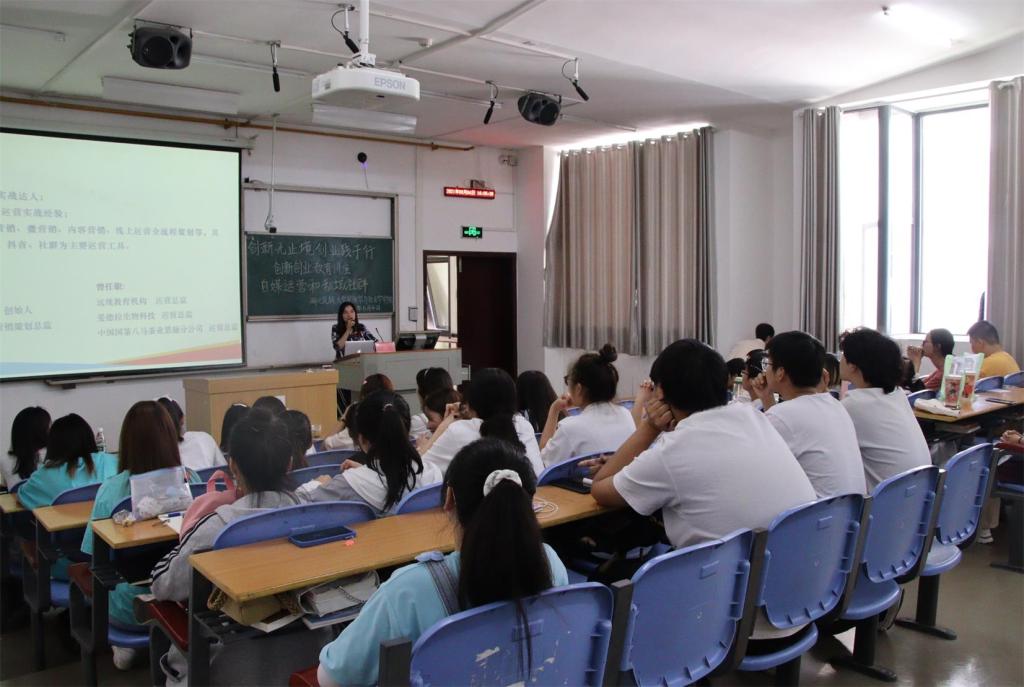 随后,于琴阐述社群运营方法详解和要点,分为创业经历、社群运营知识和交流互动三方面。针对微营销策略,她主张采取品牌打造、精准引流、用户培育、价值变现和价值裂变五步法,以她和妹妹在抖音、微信等平台联手打造宝妈产后恢复计划迅速走红为例彰显综合实力的重要性。在交流互动环节,她与部分有销售经历的学生谈论技巧,并为创新创业项目的学生解答疑惑。