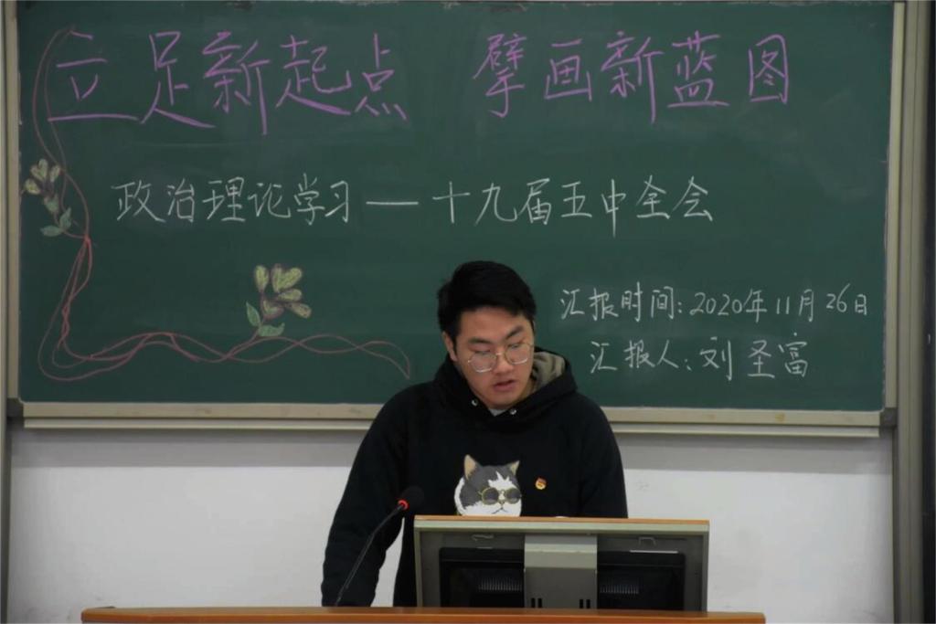 本网讯(见习记者 周树洋 刘雨/文 余喆 肖欣/图)为促进我院团学干部队伍建设,提升团学成员思想政治素养,学习先进理论知,11月26日,我院在修远楼5A502教室举办以“立足新起点,擘画新蓝图”为主题的政治理论学习活动。团总支宣传部部长刘圣富担任主讲人,我院全体团学成员参与本次活动。