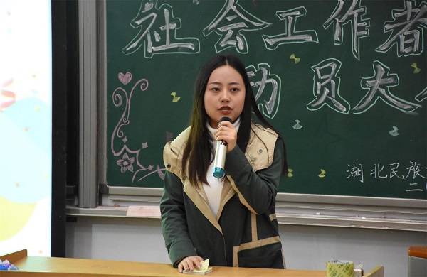 活动尾声,团总支书记熊霞和社团指导老师张雯依次上台致辞。团总支书记熊霞对新会员的加入表示欢迎,并提出积极参与活动、不断壮大队伍、传承发扬社团精神三方面的要求。同时,她表示团总支将会继续支持社会工作者协会的发展。社团指导老师张雯对社团工作表示肯定,并希望社会工作者协会不断提高活动质量,同时加强理论学习,用理论加强实践。