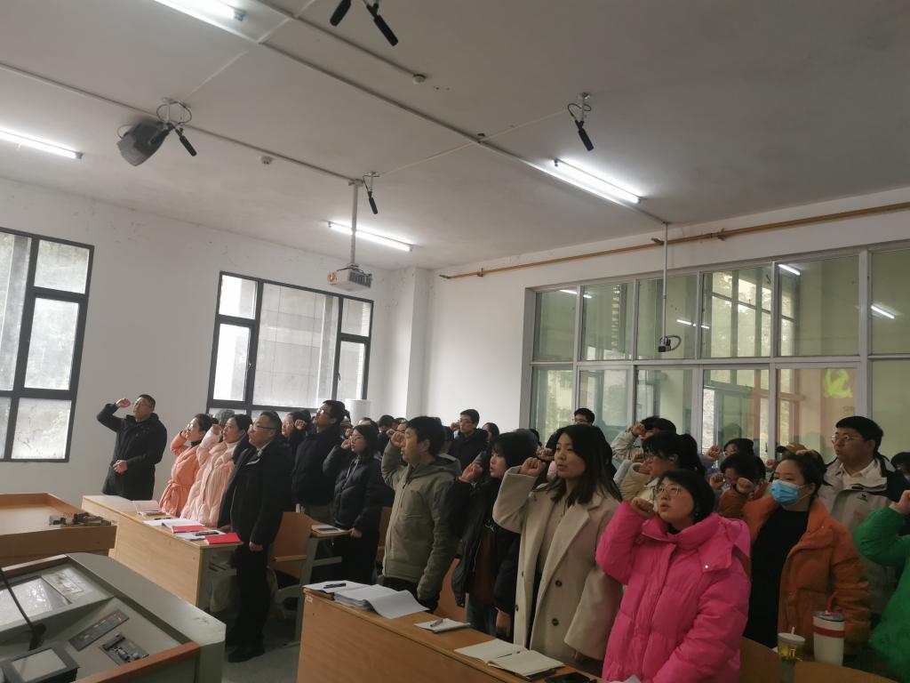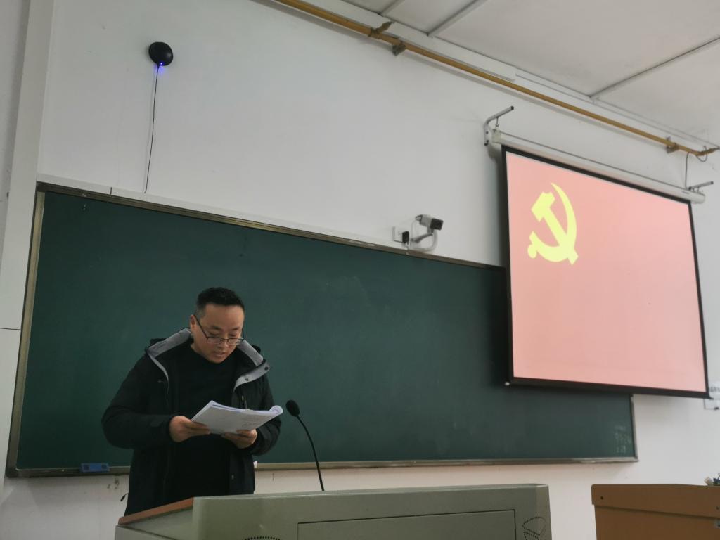 会议分为两个阶段。第一阶段,由教工党支部书记胡兆义同志组织全体党员开展了2月支部主题党日活动,全体党员重温入党誓词、诵读党章、开展学习,开展了民主议事活动。