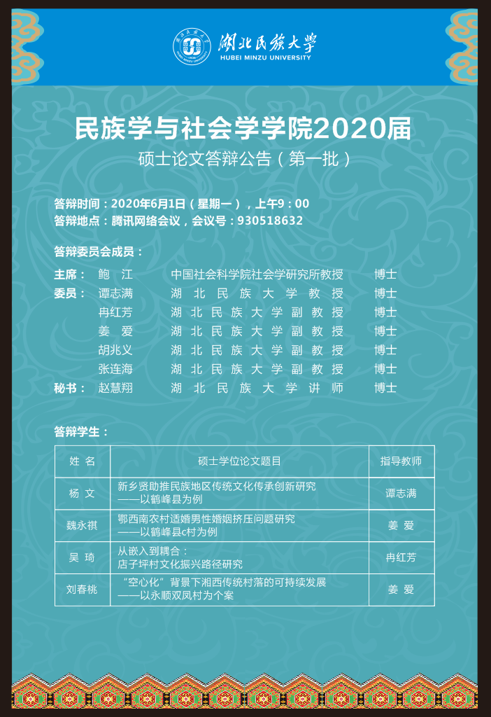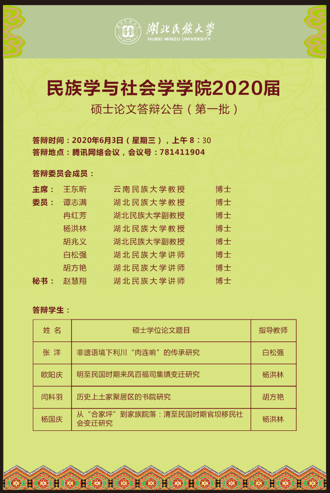 民族学与社会学学院2020届硕士论文答辩公告(第一批)