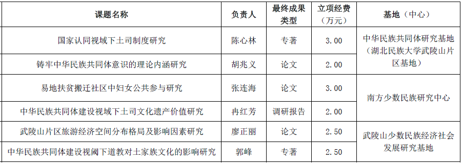 根据《关于申报中华民族共同体研究基地(bat365在线中国登录入口武陵山片区基地)、南方少数民族研究中心、武陵山少数民族经济社会发展研究基地2021年度开放基金项目的通知》和bat365在线中国登录入口校内科研项目相关管理规定,经个人申报、基地(中心)组织专家评审,拟对“国家认同视域下土司制度研究”等6个项目予以立项资助,特此公示,公示时间为2021年5月12日至5月14日。公示期内,如有异议,请向民族学与社会学学院学科建设科反映。联系电话:8297052。