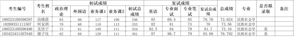 民族学与社会学学院2023年第二批调剂硕士研究生成绩及拟录取情况公示