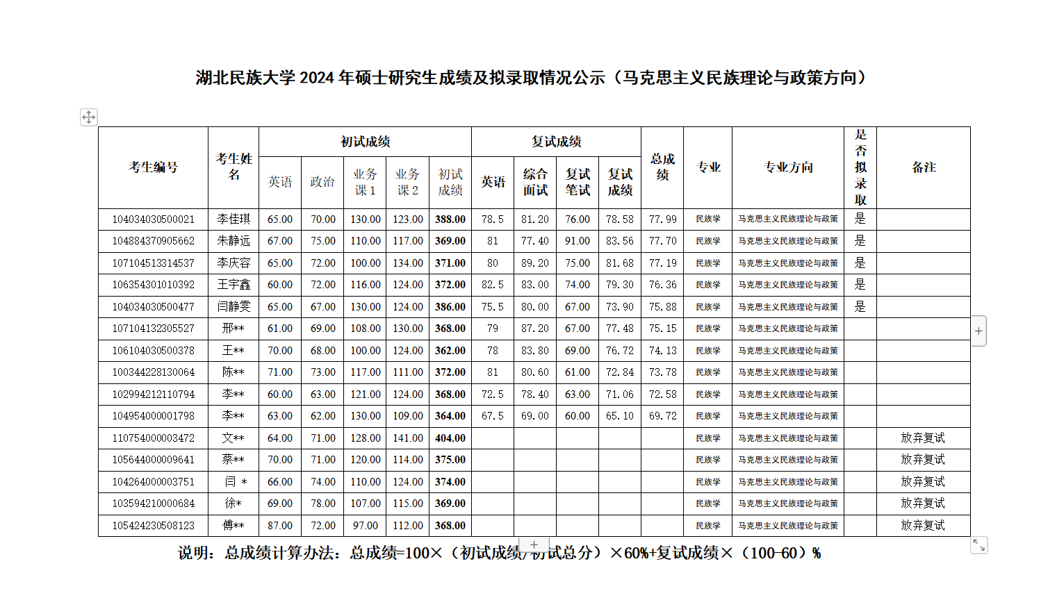 bat365在线中国登录入口2024年硕士研究生成绩及拟录取情况公示(马克思主义民族理论与政策方向)