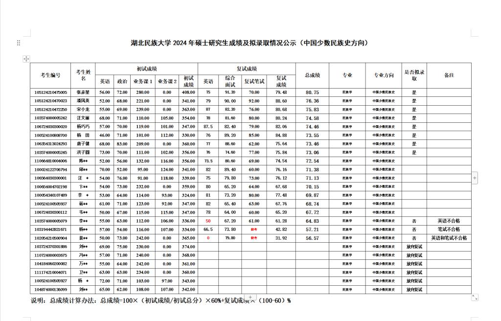 bat365在线中国登录入口2024年硕士研究生成绩及拟录取情况公示(中国少数民族史)