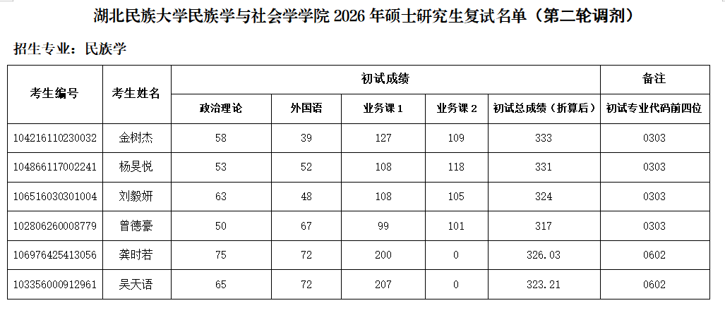 bat365在线中国登录入口民族学与社会学学院2026年硕士研究生复试名单(第二轮调剂)
