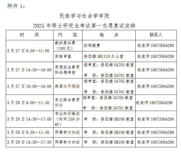 第一志愿复试时间定于2025年3月27日8:30开始,具体日程安排见附件1:《民族学与社会学学院2025年硕士研究生考试第一志愿复试安排》。调剂复试将在第一志愿复试后安排,具体通知见本院网站(/mzyjy/)公布的调剂公告。