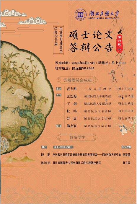 民族学与社会学学院2025届硕士学位论文答辩公告(5月18日)