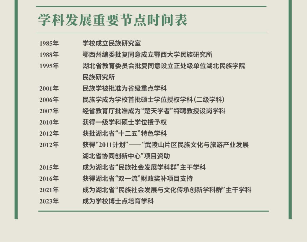 民族学学科是bat365官网首批硕士点授权学科。经过40余年建设,本学科已成为硕士学位授权一级学科、湖北省重点特色学科。原有8个二级学科,分别是民族学、马克思主义民族理论与政策、中国少数民族史、中国少数民族经济、中国少数民族艺术、民族社会学、民族法学、民族体育学。2022年起调整为5个二级学科,即民族学、马克思主义民族理论与政策、中国少数民族史、中国少数民族经济、民族社会学,2025年起按照马克思主义民族理论与政策、中华民族学、人类学与世界民族3个方向招生。学科建有国家民委中华民族共同体研究基地(bat365在线中国登录入口武陵山片区基地)、国家民委民族理论政策研究基地(武陵山片区基地)、武陵山片区基层社会发展研究基地、国家民委国家连片特区(武陵片区)农村贫困问题重点研究基地、南方少数民族研究中心、鄂西生态文化旅游研究中心、武陵山民族文化与旅游产业发展湖北省协同创新中心7个省部级科研平台。2012年,本学科获得湖北省“2011计划”建设项目“武陵山民族文化与旅游产业发展湖北省协同创新中心”。2014年获得湖北省“武陵山民族文化传承与创新”博士点建设对口支持合作项目,与华中师范大学联合培养博士生。2021年获得“民族社会发展与文化传承创新”湖北省学科群建设项目。2023年成为学校博士点培育学科。