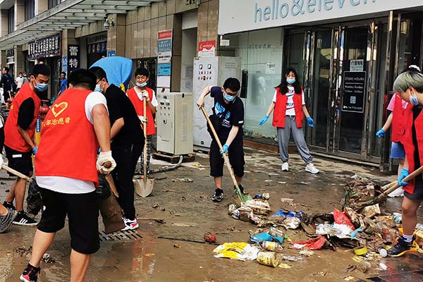 bat365官网青年志愿者清理一楼店铺被水浸泡过的物品