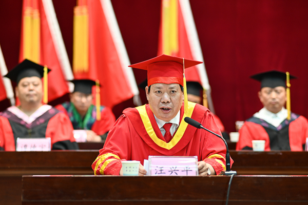 党委书记向前进为毕业研究生致辞。他回顾了同学们三年的学习成长过程,并勉励毕业生们坚定理想信仰,做一个高尚的人;涵养家国情怀,做一个奋进的人;敢于迎接挑战,做一个担当的人。他指出,心灯不灭,才能“不畏浮云遮望眼”;坚定信念,才能“咬定青山不放松”,希望同学们在未来的人生路上,不忘初心、勇于担当。(责任编辑 田甜)