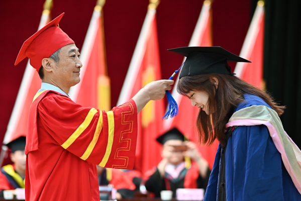 学位评定委员会主席、校长顿祖义为153名硕士学位获得者一一拨正流苏,颁发授予学位证书。