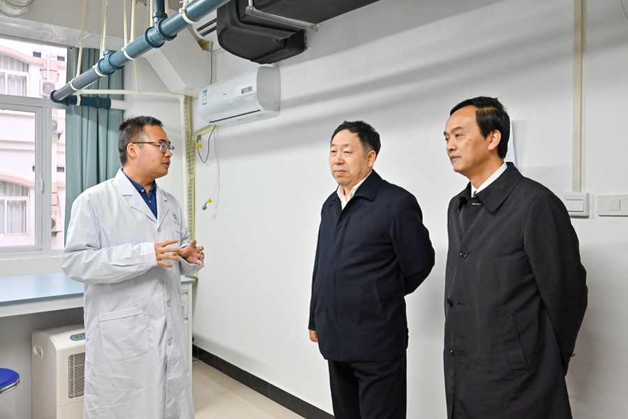 向前进(右一)陪同王学民(中)考察武陵山中药材检验检测中心