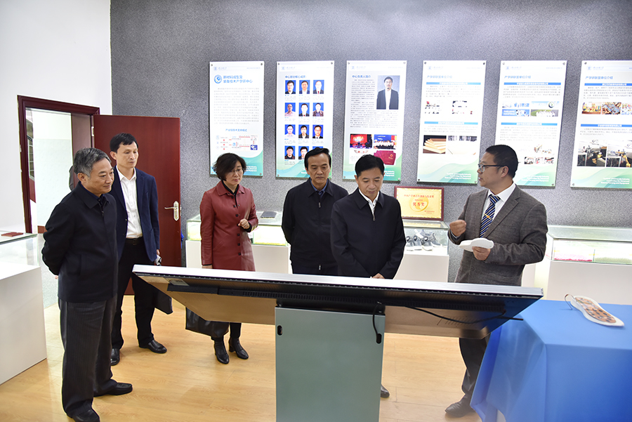 向前进(右三)、顿祖义(左一)陪同程幼金(右二)一行考察bat365官网新材料成型及装备技术产学研中心