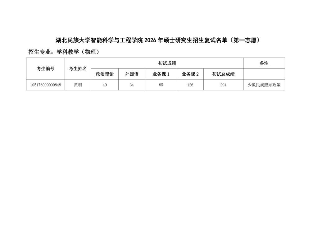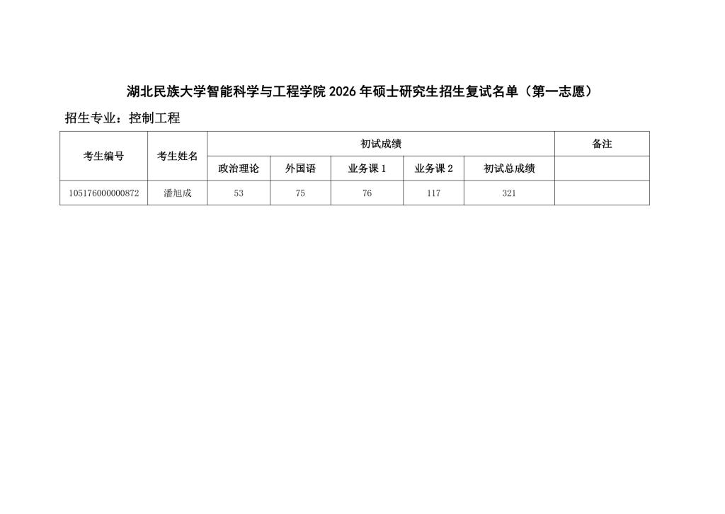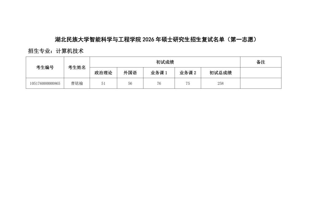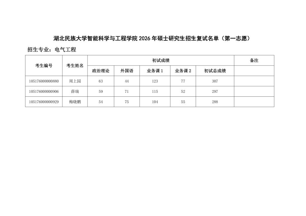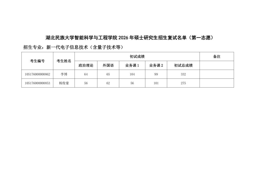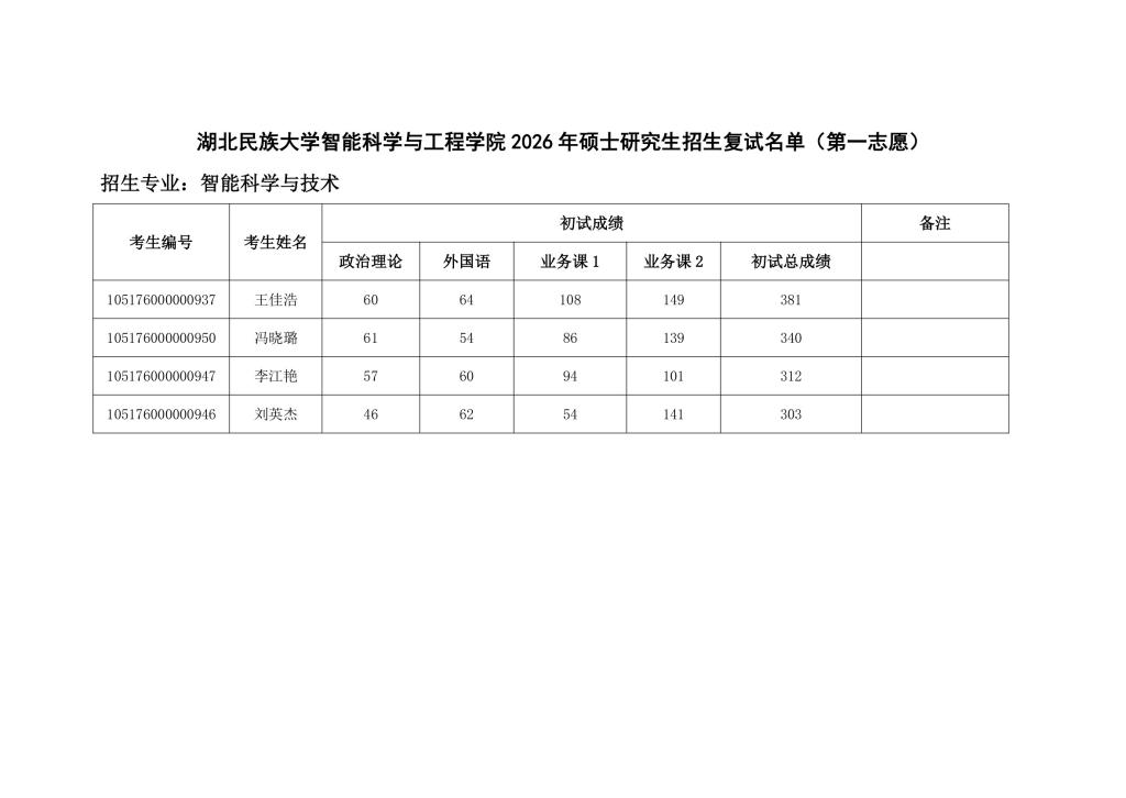 bat365在线中国登录入口智能科学与工程学院 2026 年硕士研究生招生复试名单(第一志愿)