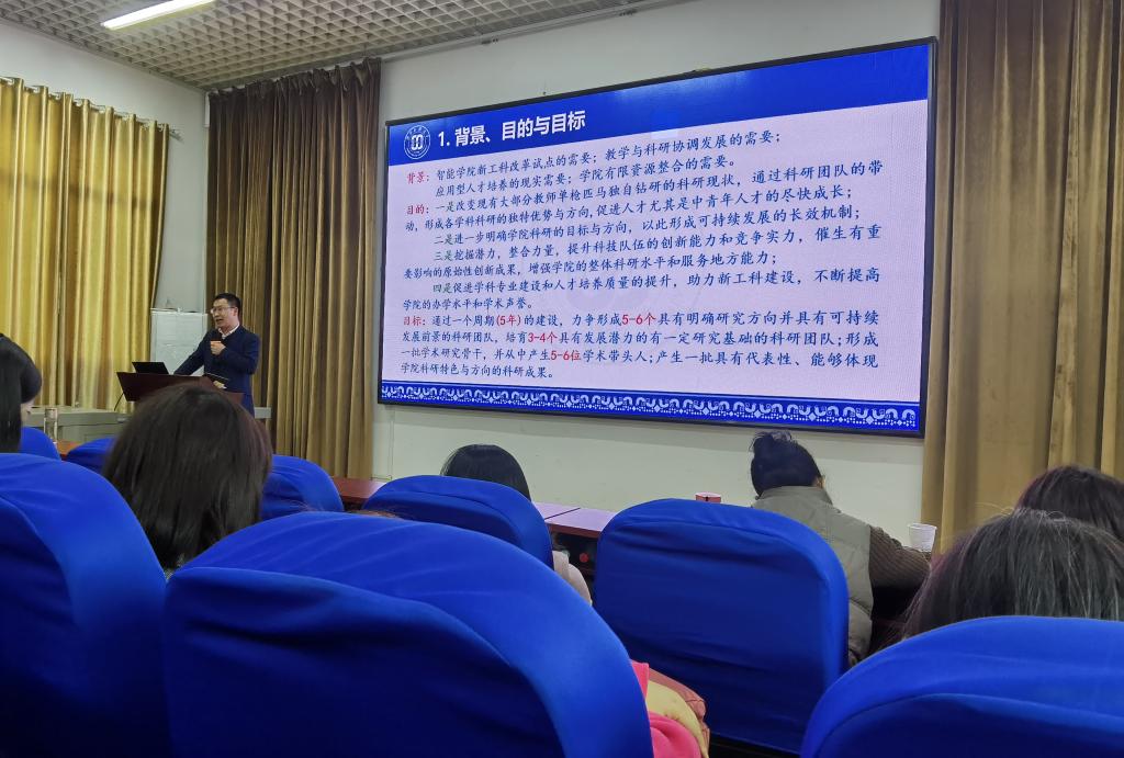 2022年3月31日,智能科学与工程学院在学院二楼学术报告厅召开科研创新团队建设推进会,党委副书记、执行院长陈世强主持会议,党委书记孙先波对《智能科学与工程学院科研创新团队建设方案》作解读,109名教职工参加会议。