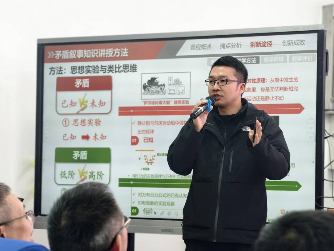 专题研讨环节中,三位教师依次作专题报告。陈恩谱老师以《如何有效开展集体备课》为题,系统阐释了恩高物理教研组的集体备课机制、流程规范与实践经验,呈现了一套可复制、可推广的教研模式;林洪主任围绕《新课程理念下高中物理评课》,从教学目标、内容组织、过程实施到效果评价,层层剖析基于核心素养的评课体系,为师范生构建了科学的课堂观察与教学评价框架;我院张源老师则以《矛盾叙事格物理,德能双驱铸精神》为题,从学科育人视角出发,深入探讨物理教学在思维训练与价值引领方面的双重功能,彰显出物理学科深厚的教育意蕴。