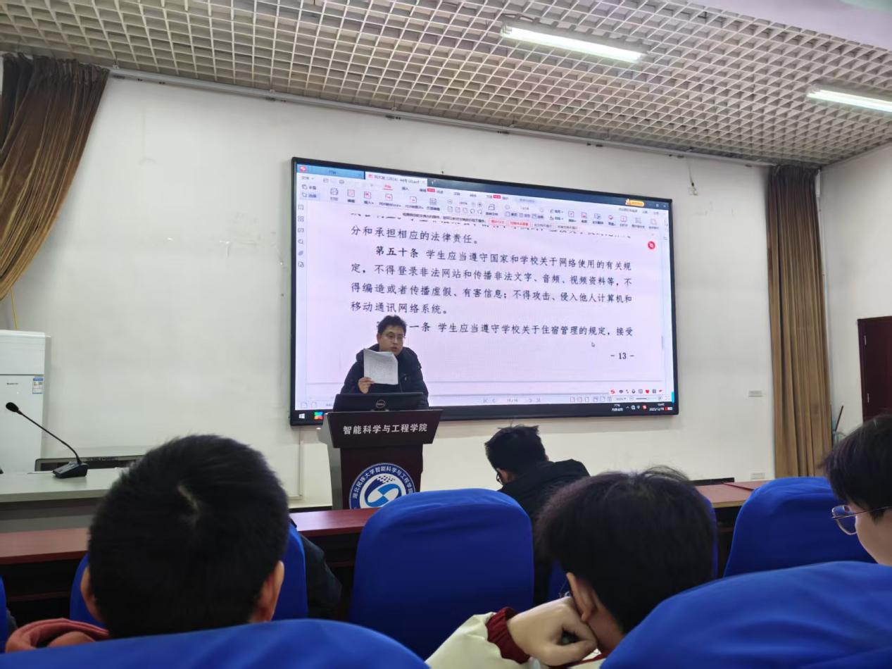 为深入落实学校依法治校、从严治校工作要求,压紧压实期末学生管理与安全稳定责任,引导学生树立规则意识、筑牢安全防线,2025年12月18日晚18:30,bat365在线中国登录入口智能科学与工程学院在集成楼213学术报告厅召开研究生管理与安全教育专题会议。学院学科办主任陈坤燚系统解读学生管理核心规章制度,研究生辅导员刘宇老师聚焦学期末安全重点工作开展专项警示教育,学院全体研究生参加会议。