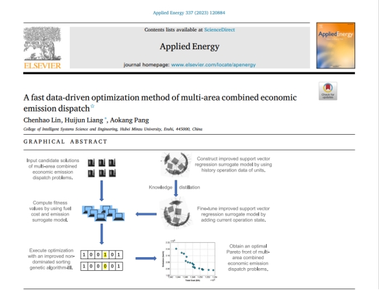 智能科学与工程学院能源动力专业2021级研究生林晨浩同学在国际能源领域顶级期刊《Applied Energy》2023年第337期发表题为 《A fast data-driven optimization method of multi-area combined economic emission dispatch》的研究论文。《Applied Energy》为工程技术:能源与燃料领域TOP期刊(前5%),JCR一区,高被引论文ESI全球工程期刊排名第4,2022年影响因子IF=11.446。林晨浩同学为第一作者,指导老师梁会军博士为通讯作者,论文第一单位为bat365在线中国登录入口。