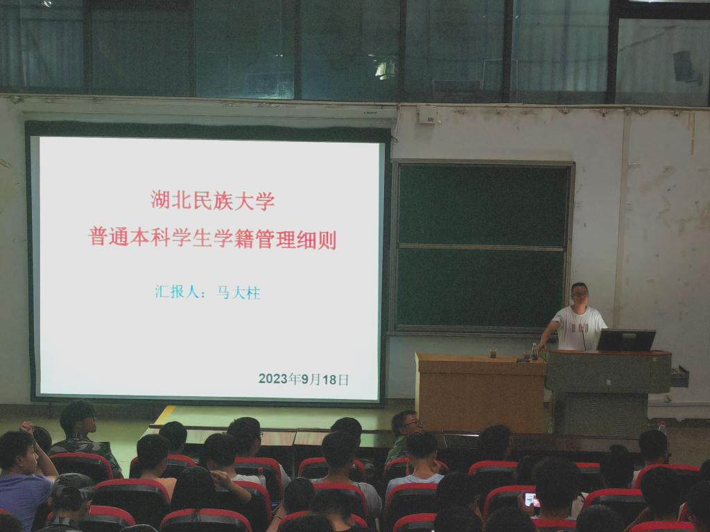 为提高新生对于bat365官网学生管理细则的认知程度,9月18日晚,我院于修远楼5B509教室举办“bat365在线中国登录入口学生学籍管理管理细则”专题知识讲座。本次讲座由我院教学管理办公室马大柱主任主讲,我院2023级全体新生参加此次讲座。