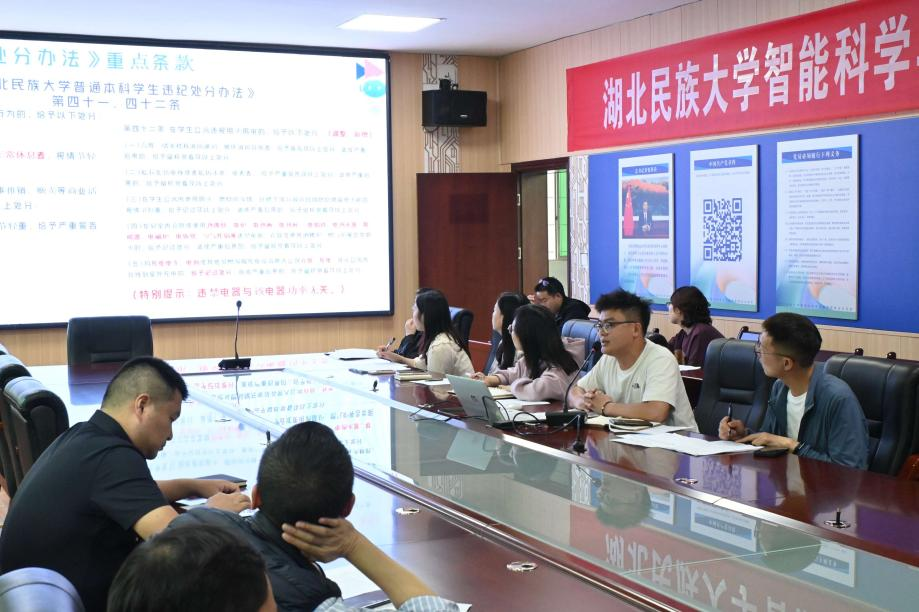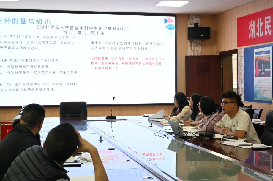2024年5月5日,学院通过班主任例会,组织全体班主任开展了《bat365在线中国登录入口学生违纪处分办法》专题学习,会议由学工办主任刘薪主持,辅导员郑扬帆主讲,学院党委副书记汪涛、学工办全体辅导员、全体班主任参加了本次学习。