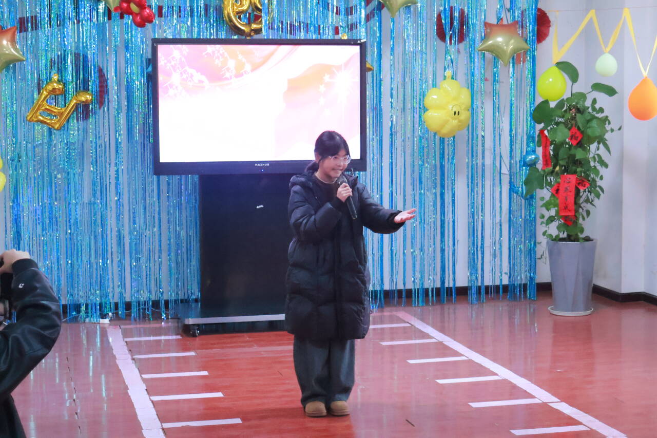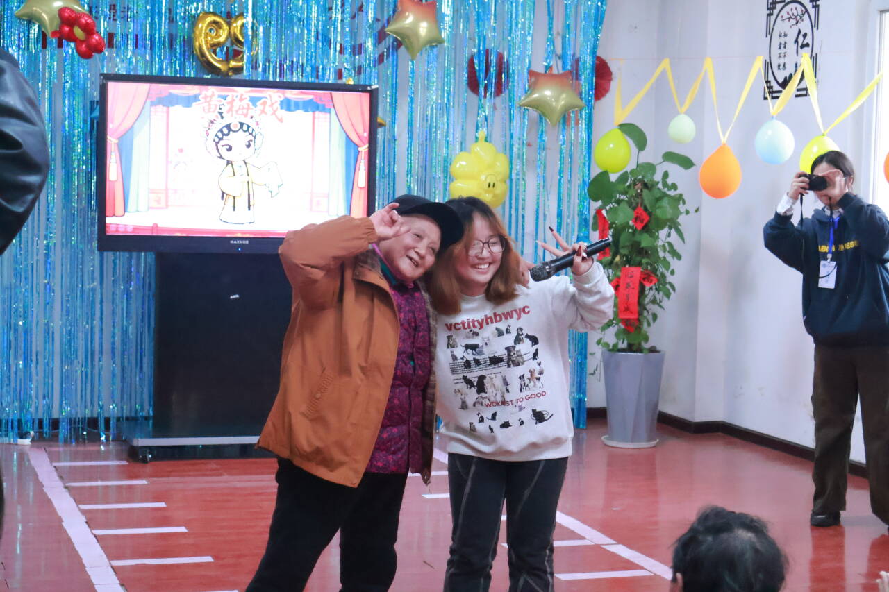 我院2023级物理专业志愿者杨书婷献上的独唱《黄梅戏》,则以婉转悠扬的唱腔为现场增添了别样的韵味,让老人们听得津津有味。