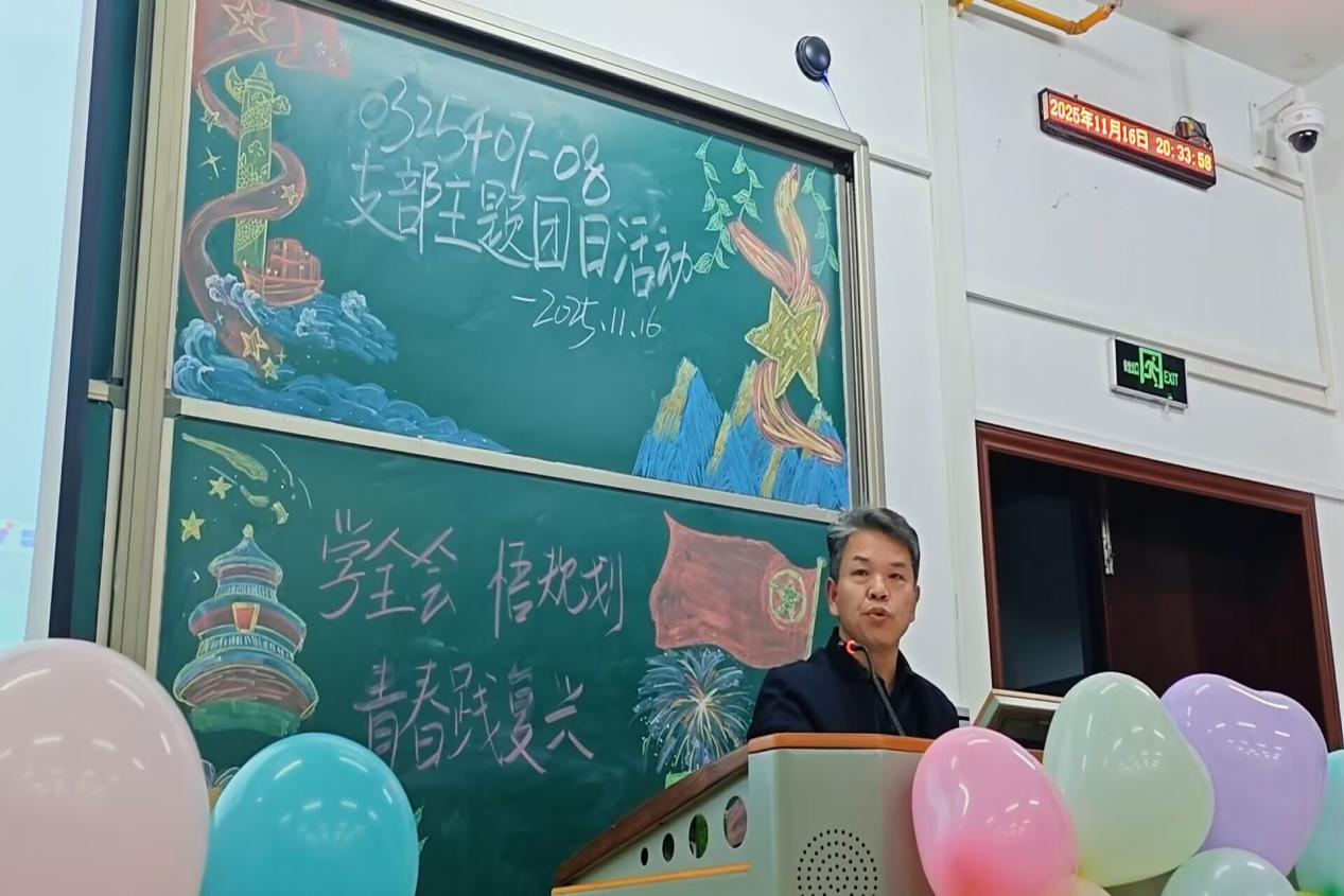 活动中,张鹏远结合自身成长经历,讲述从懵懂求学至学有所成的奋进历程,通过经验分享与答疑互动,展现出不屈进取、实干笃行的青年学习风采,为团员们树立鲜活榜样。随后,0325407-08团支部班主任范奎老师讲话,他强调“学习全会精神,勇担青年使命”并非口号,需每位同学以实际行动践行,鼓励团员们锚定目标、踏实奋进,在成长中践行青年担当。