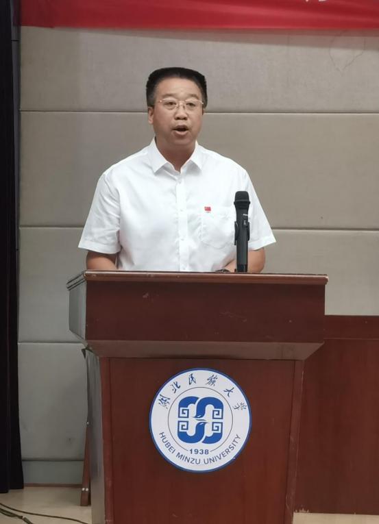 大会第三项,体育学院党总支书记、院长倪东业致辞,在对新生表示热烈欢迎的同时希望进入湖北民大校园的同学们,要坚定事成好远,主动融入国家建设,勇于前行,确立新目标,新志向。在前进的道路没有捷径,希望同学在未来学习中,做到以下几点: