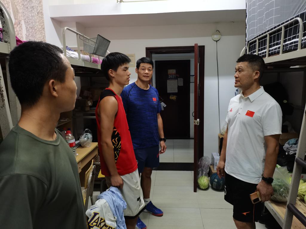 在学生寝室,何斌书记代表体育学院,向留校集训的学生表达了学院的关心;同时他鼓励他们要抓住四年一届的省民运会机会,克服困难、敢于拼搏,要用训练时的汗水浇灌出比赛场上的优异成绩;要努力为校争光,以顽强的拼搏精神在民运会赛场上创造人生出彩的机会。
