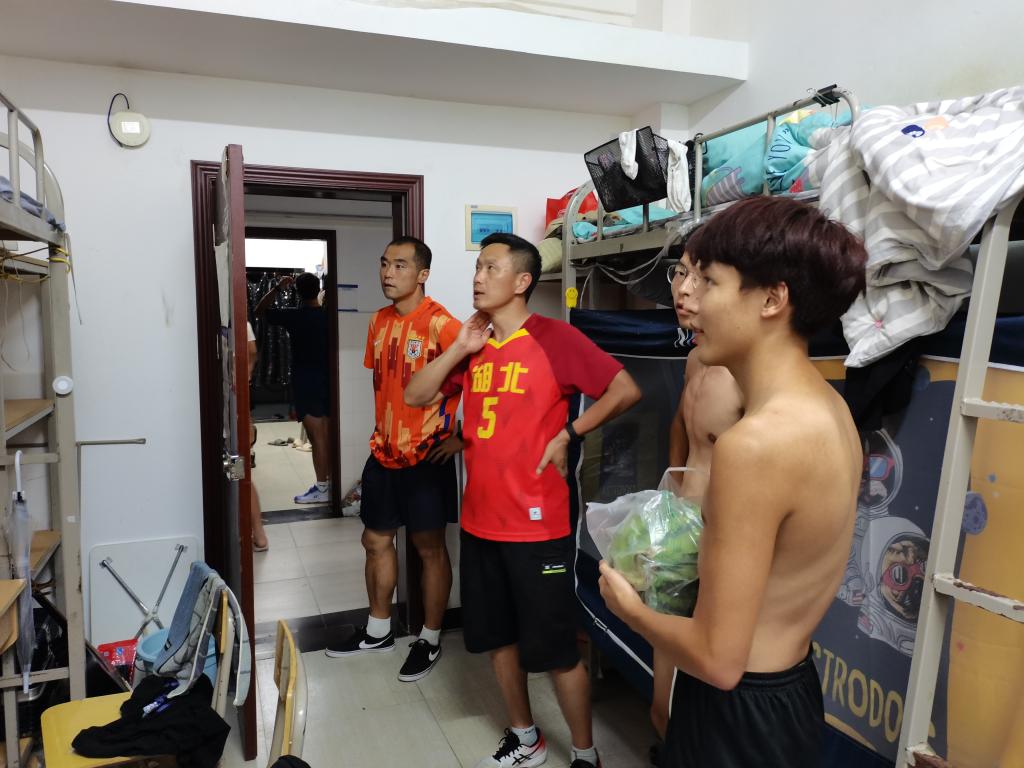 8月12日晚,体育学院党总支书记何斌、副院长胡庆华、副书记万利、院办副主任宋庆龙、学生科副科长张弋明一行,前往学生寝室看望备战湖北省第十届少数民族传统体育运动会的学生,并为他们送去20个冰西瓜,将夏日的一丝清凉带到了他们身边。