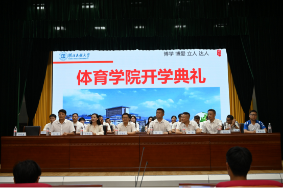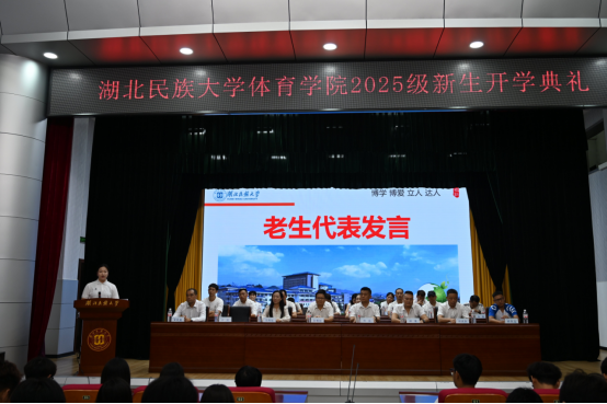 9月14日晚八点,我院2025级新生开学典礼在行政楼一号会议室隆重举行。学院领导班子成员、党支部书记、各科室负责人、系部(中心)主任、全体辅导员、新生班主任、教师代表,特邀嘉宾我院2008届校友、芭蕉侗族乡中心学校党支部书记吴海琼和09届校友、来凤维国道路建设工程有限责任公司董事长田维,以及老生代表和2025级全体新生共同出席典礼。典礼由体育学院党总支副书记万利主持。